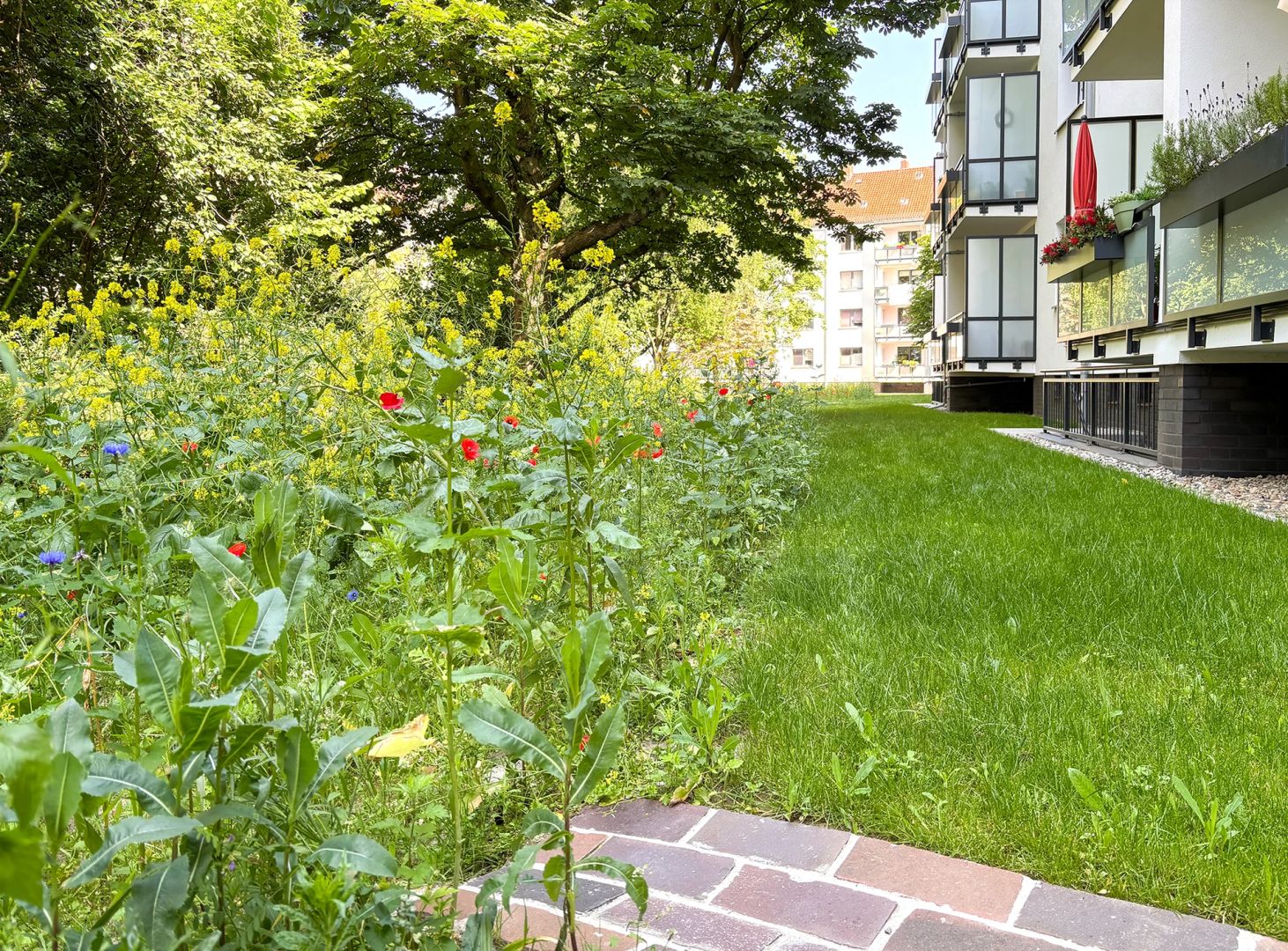 Neben der Technik wurde auch das Wohnumfeld sichtbar aufgewertet. In der Maßmannstraße 1–11 und im Moorkamp 18 in Vahrenwald entstanden neue Grünflächen, Regenwassermulden zur Versickerung, Spielbereiche für Kinder und zusätzliche Fahrradabstellmöglichkeiten. Feuerwehrzufahrten, Wege, Beleuchtung, Müll- und sogar Rollatorhäuser wurden neu gedacht und umgesetzt. Der Mietertreff im Moorkamp 18 erhielt eine neue Terrasse – ein echter Mehrwert für die Nachbarschaft.